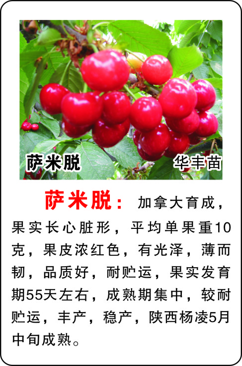薩米脫櫻桃苗:加拿大育成,果實(shí)長心臟形,平均單果重10克,果皮濃紅色,有光澤,薄而韌,品質(zhì)好,耐貯運(yùn),果實(shí)發(fā)育期55天左右,成熟期集中,較耐貯運(yùn),豐產(chǎn),穩(wěn)產(chǎn),陜西楊凌5月中旬成熟。