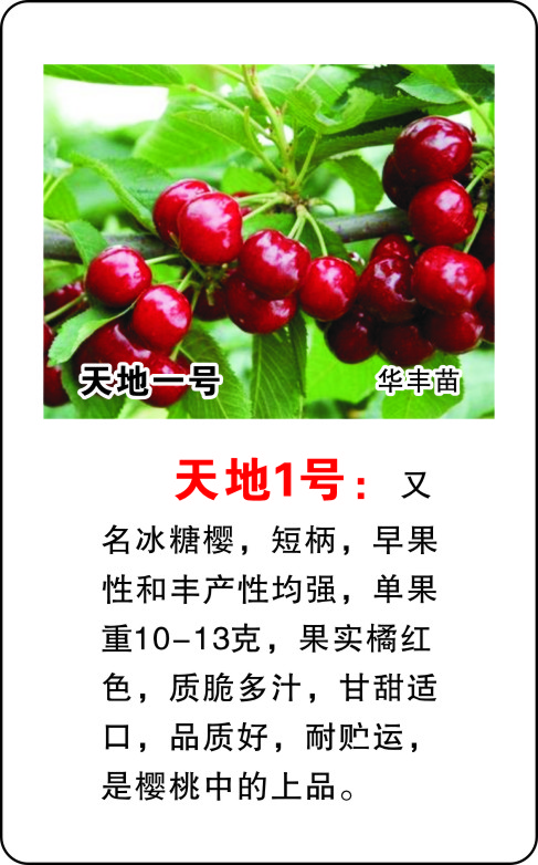 天地一號(hào)櫻桃苗:又名冰糖櫻,短柄,早果性和豐產(chǎn)性均強(qiáng),單果重10-13克,果實(shí)橘紅色,質(zhì)脆多汁,甘甜適口,品質(zhì)好,耐貯運(yùn),是櫻桃中的上品。